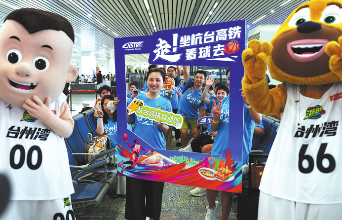 Basketball fans pose for photos in Hangzhou East Railway Station in Zhejiang. HUANG ZONGZHI/XINHUA
