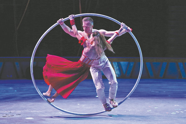 The rehearsal performance Rose Cyr Wheel by the Polish duo acrobatic group on Sept 30. [Photo by WU XIAOHUI/CHINA DAILY]