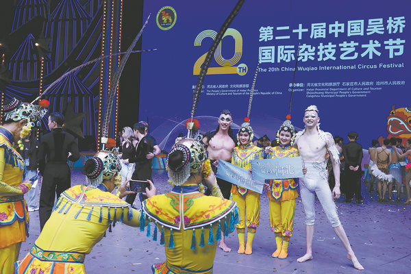 Chinese acrobats and their counterparts from the United States and Australia took a group photo after the opening performance on Sept 28. [Photo by WU XIAOHUI/CHINA DAILY]