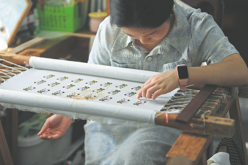 A craftswoman puts final touches on an embroidery piece in Huishan Ancient Town, Wuxi. LI XINLEI