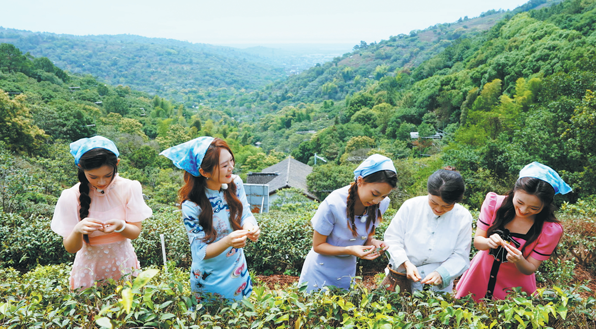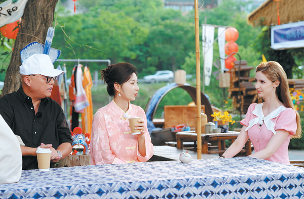 Teapots and teacups, shimmering Yun brocade, also known as yunjin, and vibrant tie-dye fabrics set the scene as TV host Meng Fei and actress Zhang Fan, better known as Lanxi, prepare their "intangible cultural heritage inn" — a temporary guesthouse where tradition meets creativity.