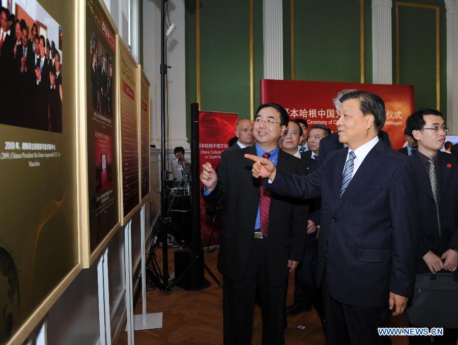 Liu Yunshan (Front), a member of the Standing Committee of the Political Bureau of the Central Committee of the Communist Party of China, attends a cultural exchange event at China Cultural Center in Copenhagen, capital of Denmark, June 11, 2014.[Photo/Xinhua]