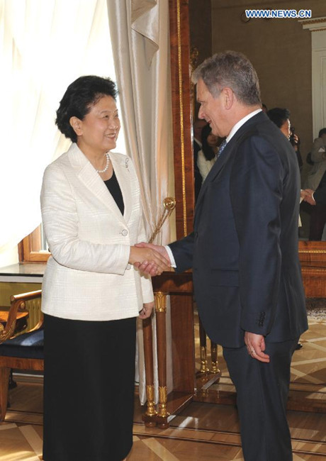 Chinese Vice-Premier Liu Yandong meets with Finnish President Sauli Niinisto at the presidential palace in Helsinki, Finland. [Photo/Xinhua] |