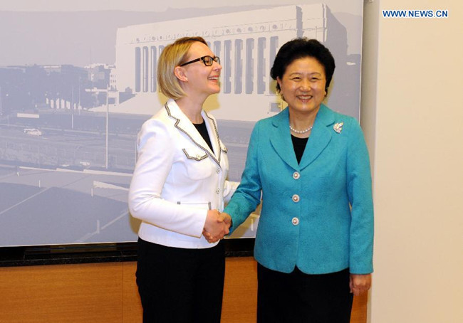 Liu Yandong meets with Finland's Speaker of the Parliament Maria Lohela in Helsinki, Finland. [Photo/Xinhua]
