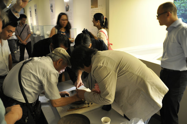 Ding porcelain artist Pang Yonghui (right, in jacket) interacts with porcelain fans. [Photo provided to Chinaculture.org]