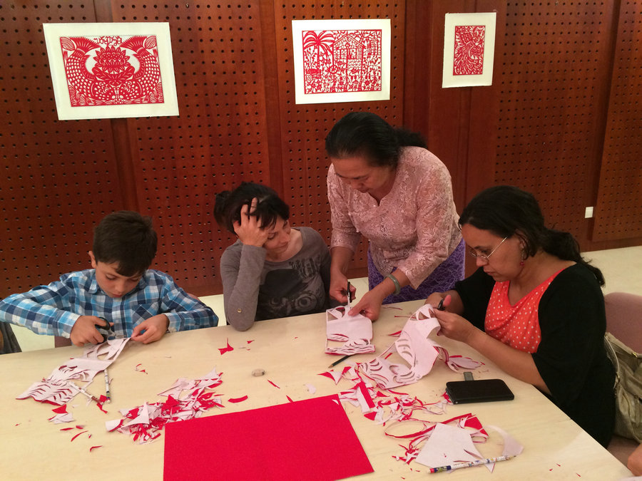 Shao Meihan (second from right) taught students to cut certain patterns out of paper.