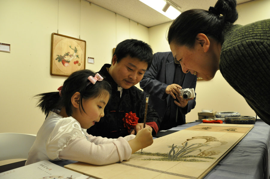 A little girl tries wood painting at the event. [Photo provided to Chinaculture.org]
