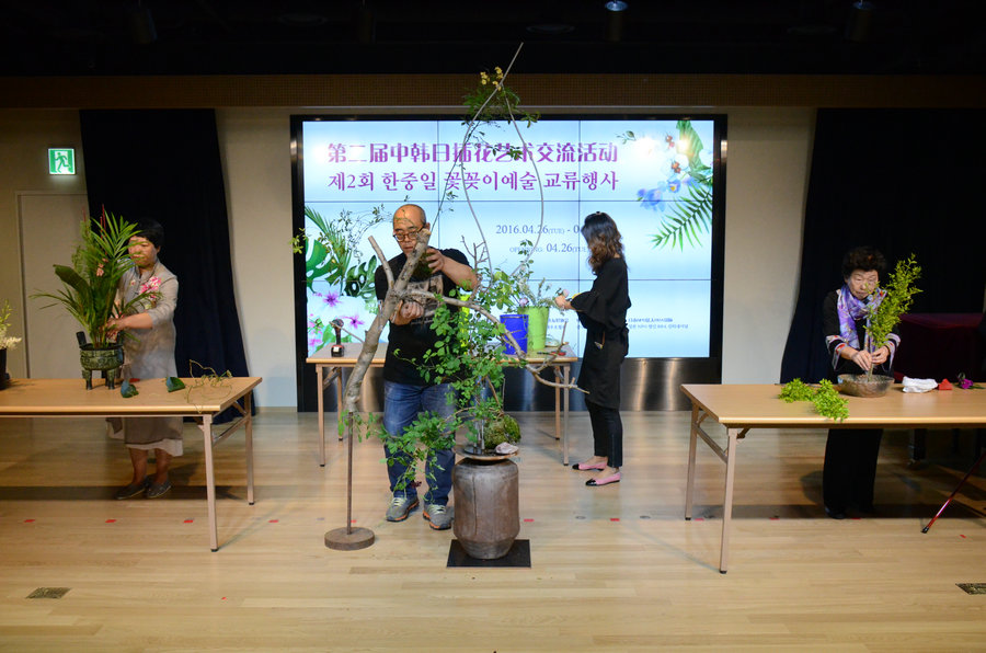 Artists from China, South Korea and Japan create flower arrangements at the event. [Photo provided to Chinaculture.org]