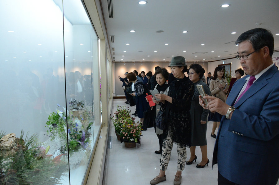 Exhibit visitors take photos of the finished floral creations. [Photo provided to Chinaculture.org]