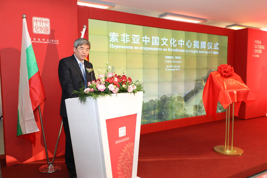 Zhang Haizhou, Chinese ambassador to Bulgaria gives a speech at the opening ceremony of the Sofia China Cultural Center, Nov 23, 2017. [Photo by Li Jieying/provided to Chinaculture.org]