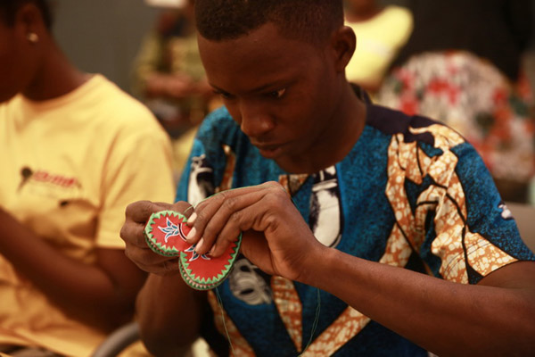 A Beninese man sews a sachet with horsetail threads at a workshop at the China Cultural Center in Benin. [Photo/Chinaculture.org]