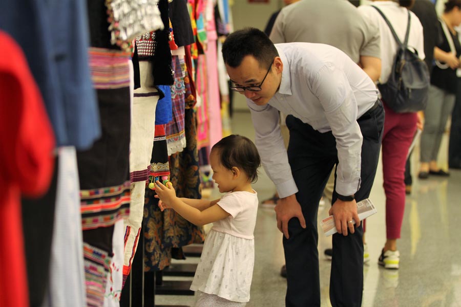A child touches ethnic costumes on display at the China Cultural Center in Bangkok, March 2, 2018. [Photo/Chinaculture.org]
