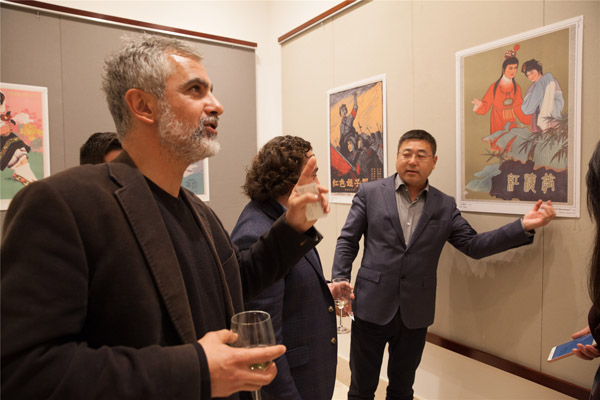 Zheng Lu, an official from the Chinese Embassy in Malta, shows classic Chinese film posters to foreign guests at the China Culture Center in Malta on March 29, 2018. [Photo/Chinaculture.org]