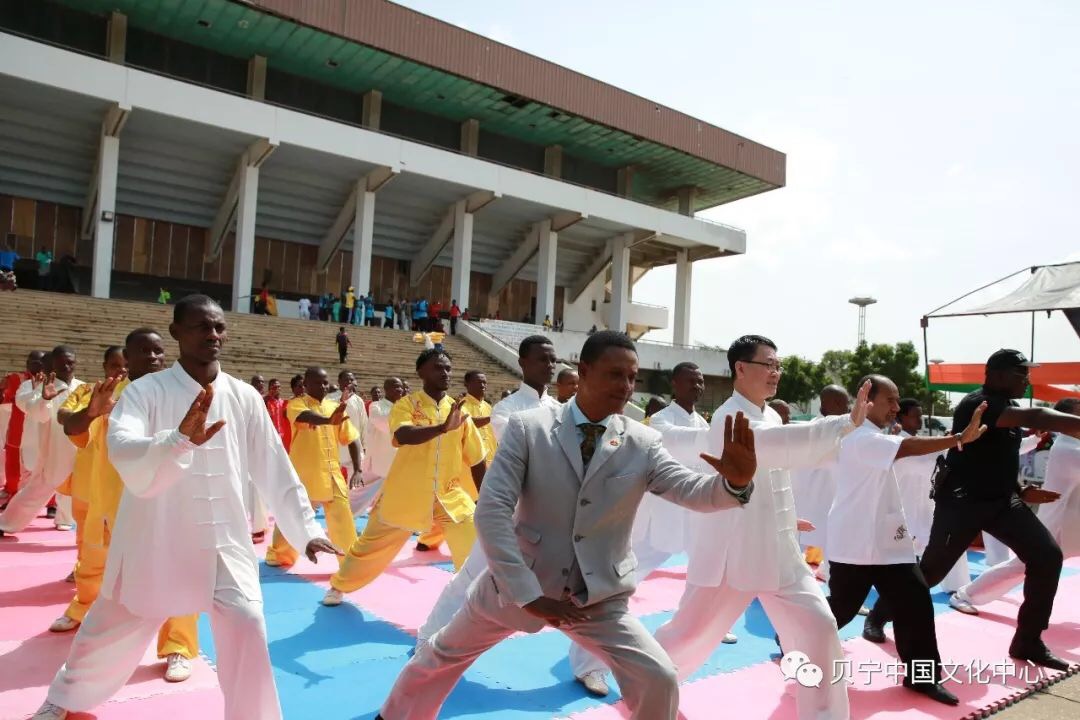 Participants at World Tai Chi Day in Benin perform with the tai chi Sword at the Friendship Stadium's square in Cotonou, April 28, 2018. [Photo/official WeChat Account of the China Culture Center in Benin]