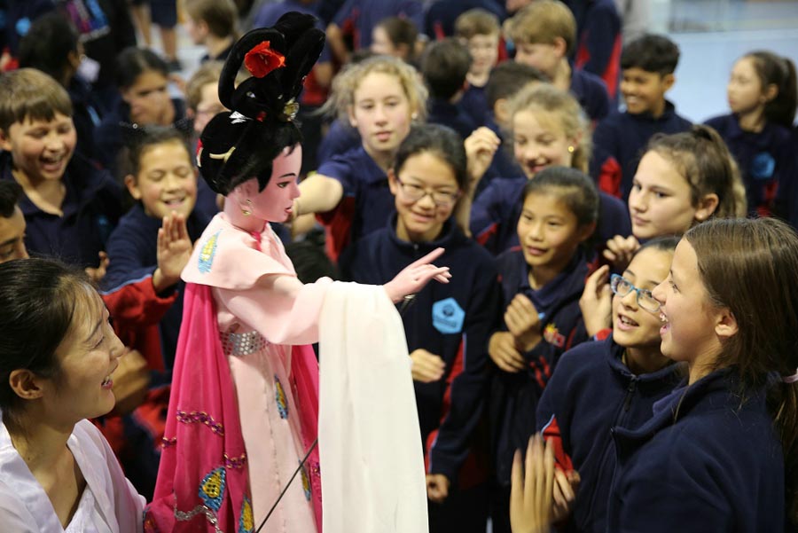 Traditional Chinese puppets attract local students in Newlands College, New Zealand, June 7, 2018. [Photo/Chinaculture.org]