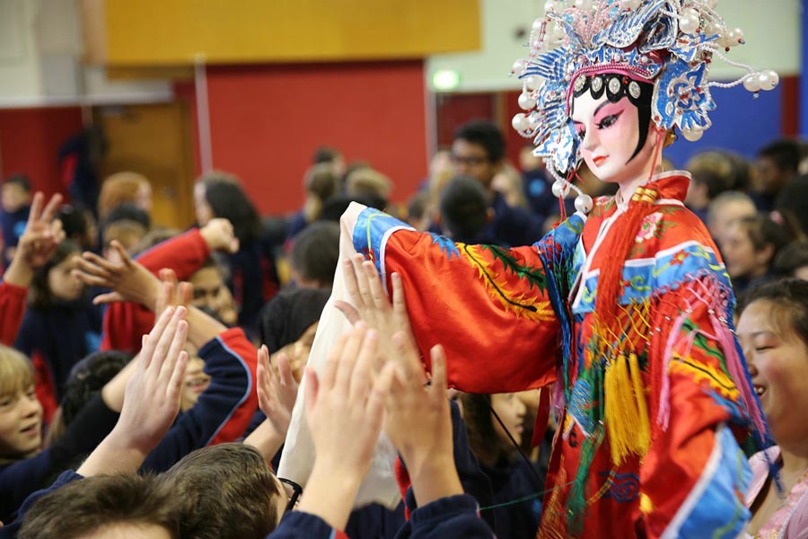 Traditional Chinese puppets attract local students in Newlands College, New Zealand, June 7, 2018. [Photo/Chinaculture.org]