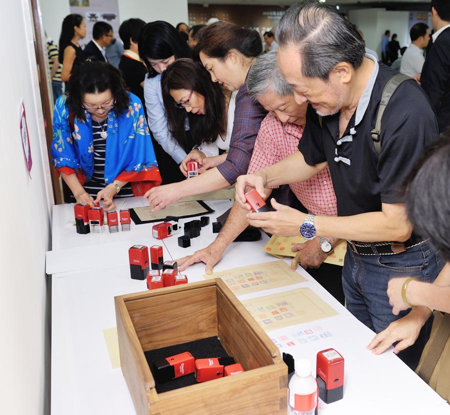 Singaporeans try Chinese seals at the China Cultural Center in Singapore, June 1, 2018. [Photo/Chinaculture.org]