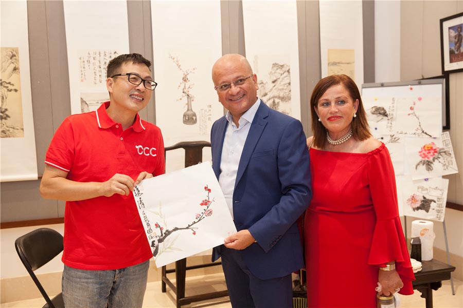 Chinese painter Chen Jing presents his painting to Deo Debattista, Oct 6, 2018. [Photo/Chinaculture.org]