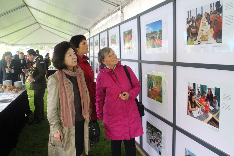 Visitors look at photos on display at a theme exhibition highlighting people-to-people exchanges over the five years of the BRI at the Chinese embassy in Ottawa on Sept 25, 2018. [Photo/Chinaculture.org]