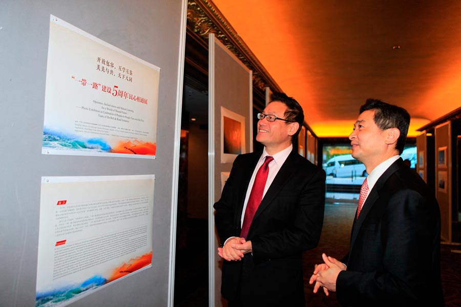 New Zealand's Member of Parliament Raymond Huo and Zhou Wei, deputy consul-general of the Chinese consulate general in Auckland, look at pictures on display on Sept 28, 2018. [Photo/Chinaculture.org]