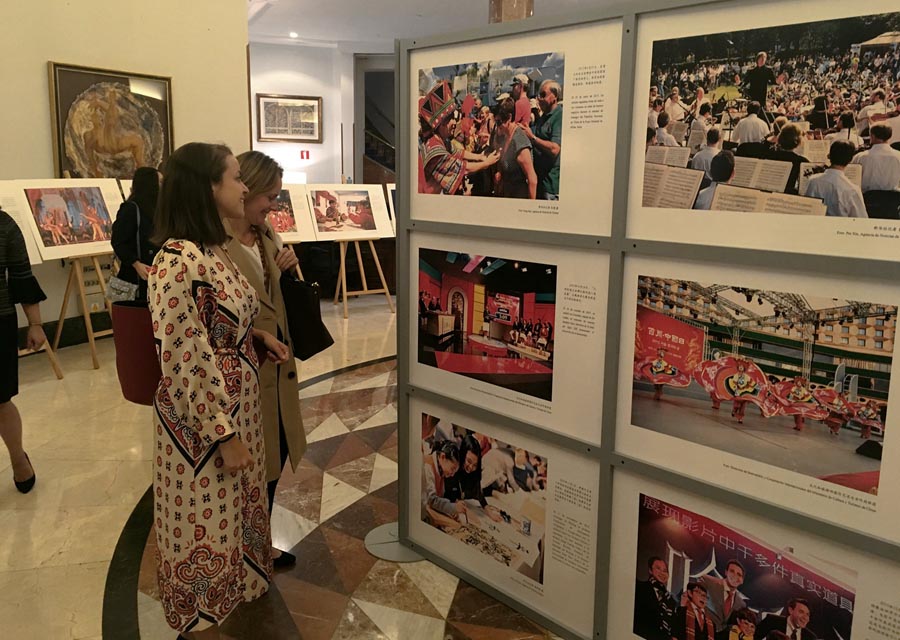 Visitors look at photos on display at a theme exhibition highlighting people-to-people exchanges over the five years of the BRI in Madrid on Sept 26, 2018. [Photo/Chinaculture.org]