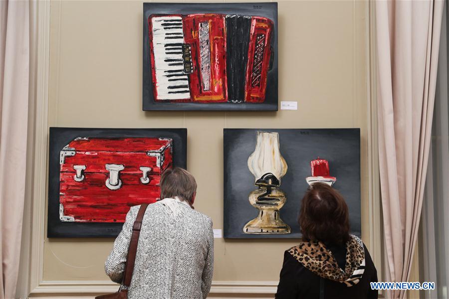 Visitors view Chen Weimin's work Individual Logic of History at the exhibition "the Wind from the Sea - Modern Aesthetics of Shanghai School and Youth Art" in China Cultural Center, Brussels, Belgium, on Nov 14, 2018. The exhibition, which will last till Jan 15, 2019, showcases contemporary works of 27 young artists. [Photo/Xinhua]