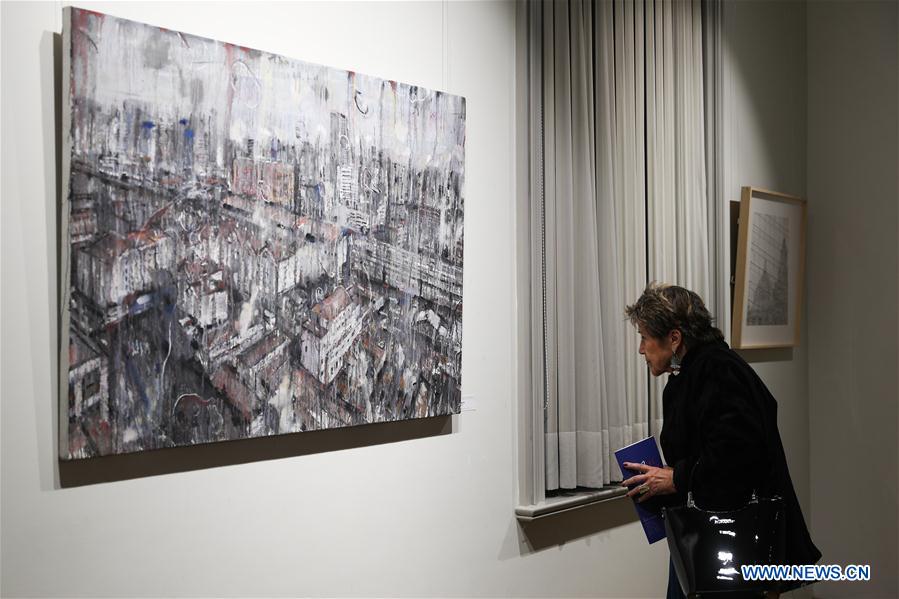 A visitor views Zhao Zhengrong's work Urban at the exhibition "the Wind from the Sea - Modern Aesthetics of Shanghai School and Youth Art" in China Cultural Center, Brussels, Belgium, on Nov 14, 2018. [Photo/Xinhua]