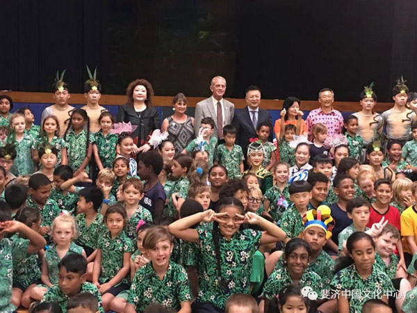 Guests and members of a local audience take a group photo with Chinese acrobats. [Photo/Chinaculture.org]