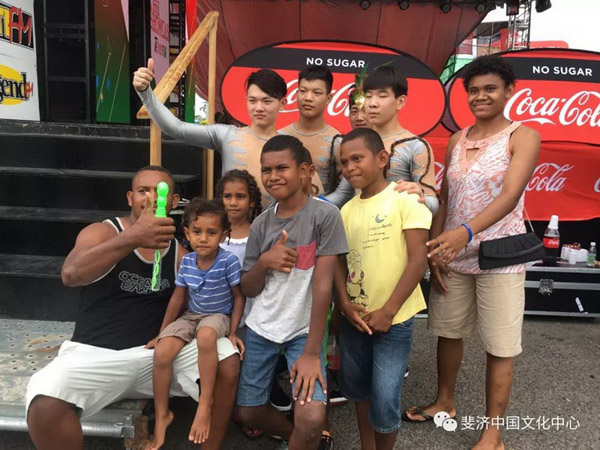 Fijians take a photo with Chinese acrobats. [Photo/Chinaculture.org]