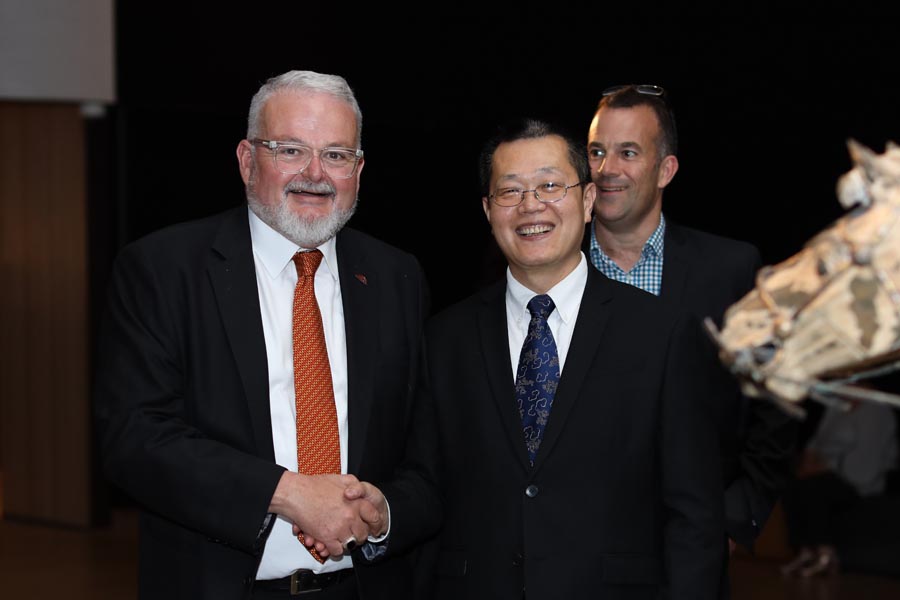 Guo Zongguang (right), director of the China Cultural Center in New Zealand, takes a photo with Evan Williams, chair of Te Papa's Board, Dec 13, 2018. [Photo/Chinaculture.org]