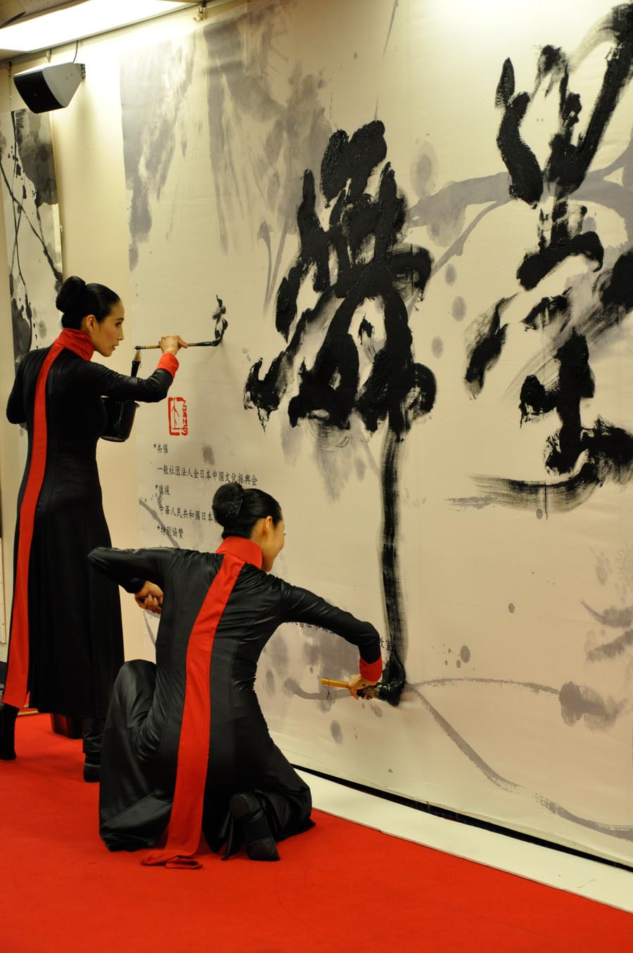 Artists Mai Nakanishi and Lorelei Chang create calligraphy works at the China Cultural Center in Tokyo on Feb 19, 2019, opening a two-week exhibition featuring their painting and calligraphy works through March 1. The twin artists are known for their unique style of "ink dancing" by combing dancing with calligraphy and ink painting. [Photo/Chinaculture.org]