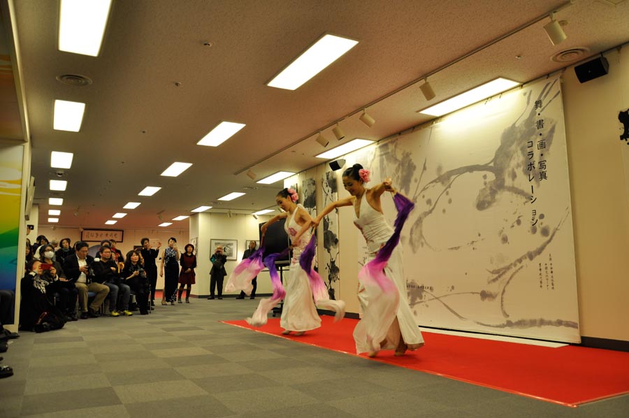 Artists Mai Nakanishi and Lorelei Chang dance at the China Cultural Center in Tokyo on Feb 19, 2019. Exhibition Ink and Dance, running at the center through March 1, features their calligraphy works as well as photography and paintings co-created with international artists. [Photo/Chinaculture.org]
