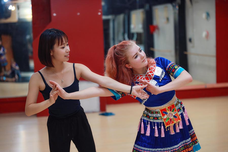 Zhang Ya (left), a teacher with the Oriental Dance Academy in Wellington, guides students in a traditional dance of the Miao ethnic group. The dance integrates scenes and performance elements of Miao festivals, agriculture and entertainment, embodying the optimistic and positive character of the local women. [Photo/Chinaculture.org]