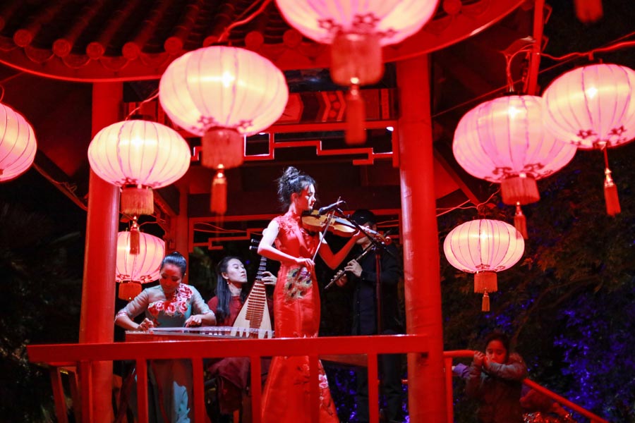 A New Zealand student plays violin while Chinese musicians play the guzheng, pipa and flute during the 10th Chinese Lantern Festival in Hastings, New Zealand, on April 5, 2019. [Photo/Chinaculture.org]