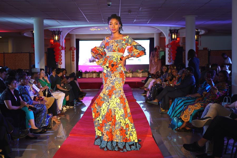 A Nigerian model walks the runway at the China Cultural Center in Abuja, Nigeria, on March 7, 2019, as part of a cultural event celebrating the International Women's Day. A wide array of cultural activities, such as fashion show, art exhibition, folk music performance and food festival, were held to showcase various achievements made by women from both China and Nigeria. [Photo/Chinaculture.org]