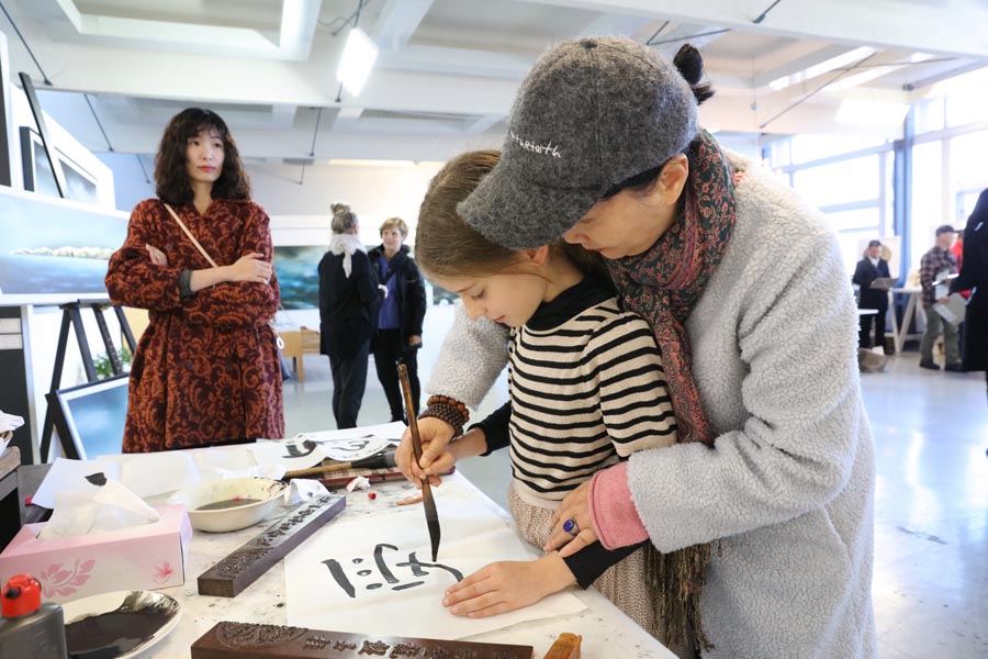 A child is guided as she learns to write the Chinese character for love using an ink brush at an art gallery in Wellington, New Zealand, on July 11, 2019. It's a sideline event of Image & Imagination: China-New Zealand-Australia Art Exhibition, which showcases representative artworks of artists from the three countries. [Photo/Chinaculture.org]