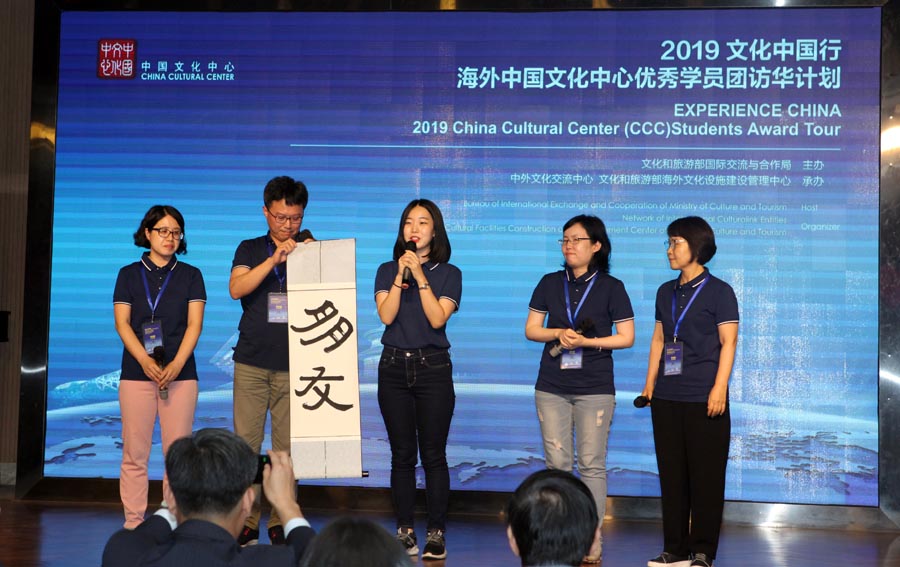 South Korean students show a calligraphy work of Chinese characters that spell "friends" in Beijing, Aug 20, 2019. [Photo provided to Chinaculture.org]