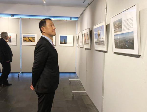 Zhang Yong, Deputy Director-General of the Cyberspace Administration of China's News and Communications Bureau, views photos at the exhibition. [Photo provided by Wu Haixia]