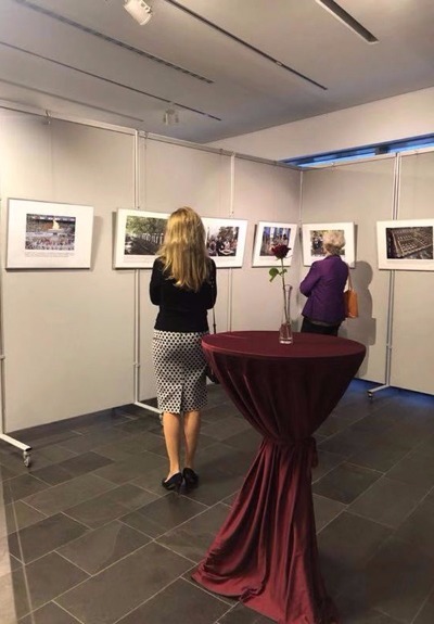 A guest views photos at the International Photo Exhibition Celebrating the 70th Founding Anniversary of the People's Republic of China at Germany's China Cultural Center on Sept 22. [Photo provided by Wu Haixia]