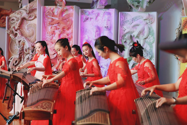 Ling Jia, a guzheng teacher at the China Cultural Center in Wellington performs guzheng with her students . [Photo by Zhang Jianyong/provided to Chinaculture.org]