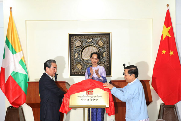 The China Cultural Center in Yangon was jointly unveiled by Chinese Foreign Minister Wang Yi and Myanmar Minister of Religious Affairs and Culture Thura U Aung Ko on Nov 19, 2017. Myanmar State Counselor Aung San Suu Kyi attended the ceremony.