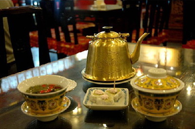 Dawan tea is just as famous as the long-spouted teapot. The Chinese name means "inexpensive tea in a big tea bowl" and it was another old Beijing teahouse specialty. It's said that the founder of Lao She Teahouse, started his business by serving Dawan tea for just two cents each. And today it's the only teahouse still serving Dawan tea for two cents a bowl, even though there's no profit in it.