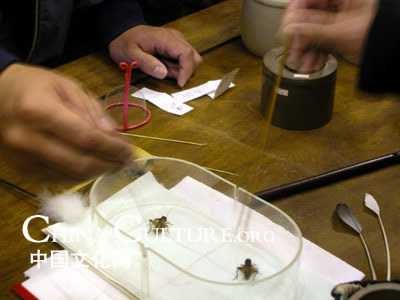 A cricket fight in China is as ritualistic as a bullfight is in Spain — and there is equal respect for both of the creatures involved. As has been the tradition for centuries, two crickets are weighed and then matched up according to size, weight, and color. Both combatants are placed in a small fighting arena, with walls high and thick enough to prevent desertion. The cricket trainers stimulate their charges with a straw or a fine-haired brush, and then the insect warriors go at each other, antennae waving and jaws snapping.