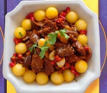 It's a famous traditional dish in the Qingcheng Mountain region not far from Chengdu. Besides the fame as " the best peaceful place under heaven, " Qingcheng Mountain is also well-know for its tea, Yangtao wine, pickled vegetables and braised chicken with ginkgoes. Legend has it that a Taoist priest created the dish. In the mountain there is a ginkgo tree with a history of 500 years bearing big and solid fruit. The taoist priest used the ginkgoes as an ingredient to braise chicken, which cured a person who was thought to be incurably ill. This got around and won fame for the dish in Chengdu and throughout the province. The dish has gradually become a local specialty featuring light yellow color, tender and fresh meat, white and fragrant broth, and slightly sweet ginkgoes.
