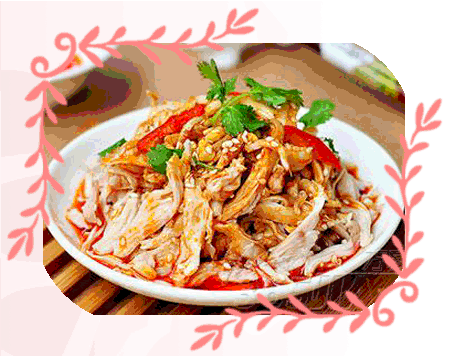 Ingredients: tender rooster breast or leg 250g, seasame sauce 5g, scallion 5g, red chili oil 10g, surgar 2.5g, soy sauce 15g, MSG 0.5g, Chinese prickly ash 0.5g, seasame oil 1.5g.