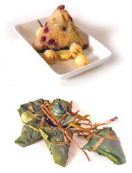 If wrestling with bamboo leaves and reeds is beyond you, get some pretty rice bowls and pack in the mixture and lotus nuts. Steam over high heat for two hours, turn out on a plate and serve. It tastes just as good!