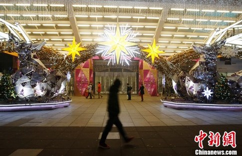 The entrance to one of the shopping malls in Xidan, the site of a number of Beijing's major shopping centers, is decorated with giant swan sculptures illuminated by electric lights. The shopping malls are offering customer discounts as the Christmas shopping season approaches.(Chinanews.com Photo)