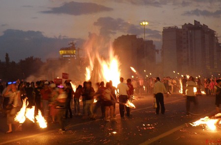 During the day, people drink liquor to celebrate the festival and take part in wrestling and bullfighting activities. In Wuding and Luquan Counties, the Yi also have activities such as archery, horse racing and swinging . At night, everyone lights a torch that is 2 meters long and 20-30 cm in diameter, which are made of dry pine sticks. Holding the torch high, they gather in front of their villages or near the village square. Then, they run in the pine forests and on the farmland to drive away insects and evil spirits, and pray for a good harvest.