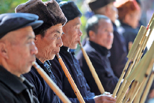 Elderly Miao people play lusheng, a traditional wind instrument made of bamboo and wood, in Xijiang Qianhu Miao village.