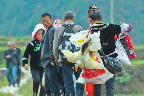 An ethnically Miao woman in Taoyao Miao village in Leishan county, Guizhou province, carries special purchases she'll give her relatives for Guzang Festival, the grandest Miao celebration.